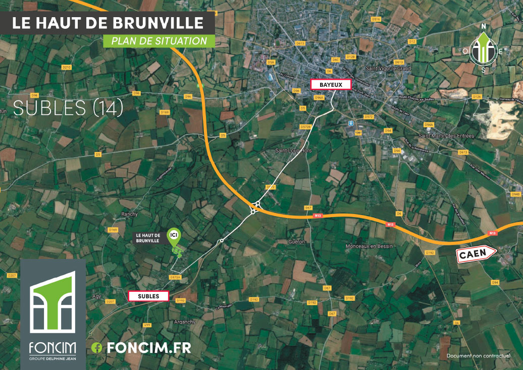 Le lotissement "Le Haut de Brunville" situé à Subles vous permet de conjuguer le plaisir de vivre à la campagne dans un cadre verdoyant avec un accès rapide à Bayeux (6 km - 5 min), 25 minutes de Caen et 20 minutes de la mer.