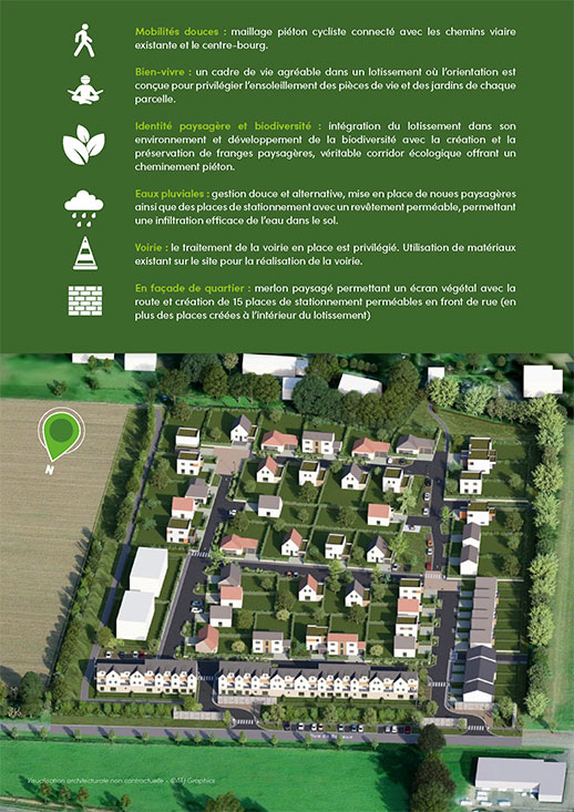 La façade du lotissement sera paysagé, sur la frange Ouest une allée arborée sera créée et au sein du lotissement et sur la frange Est, des allées avec haies seront créées ou préservées.